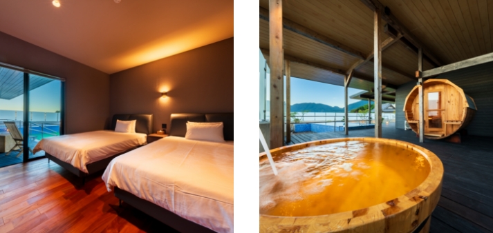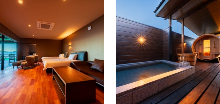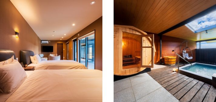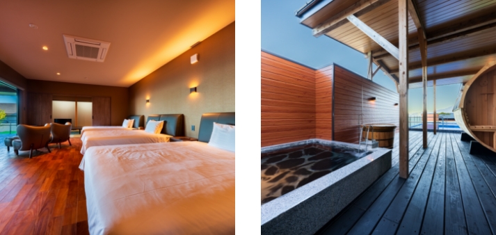 全23棟の客室に露天風呂、内湯、低温バレルサウナ、水風呂、ウッドデッキ、